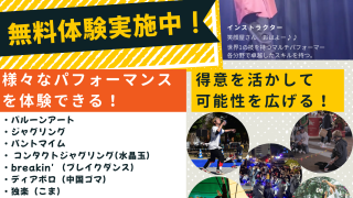 大道芸スクール情報 大道芸スクール生徒募集中! 4月1日大道芸スクール開校!!自分の「得意」や「楽しい」をぐんぐん伸ばせる大道芸スクール✨頭も体もフルに使って、新しい自分に出会おう!「できた!」の瞬間が、自信と笑顔につながる🎉楽しみながらスキルアップできる最高の環境で、一緒にチャレンジし... 2025.03.03 大道芸スクール情報